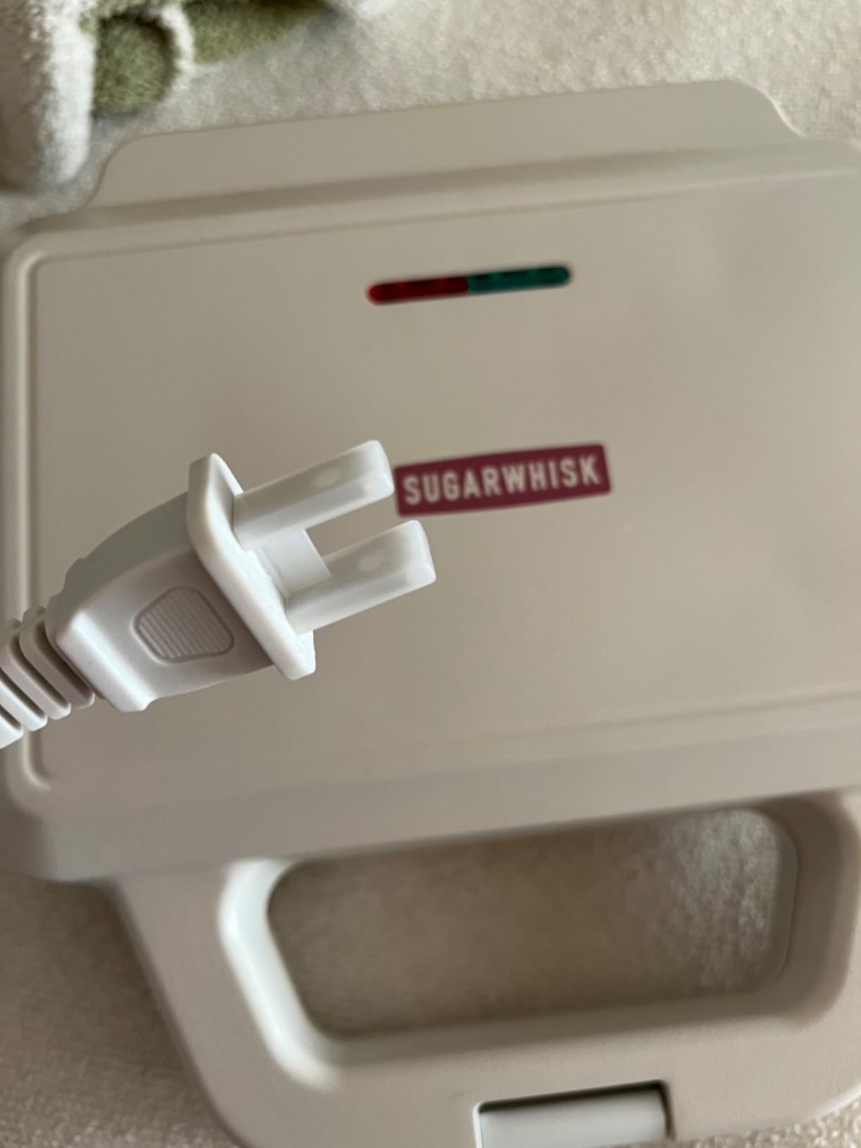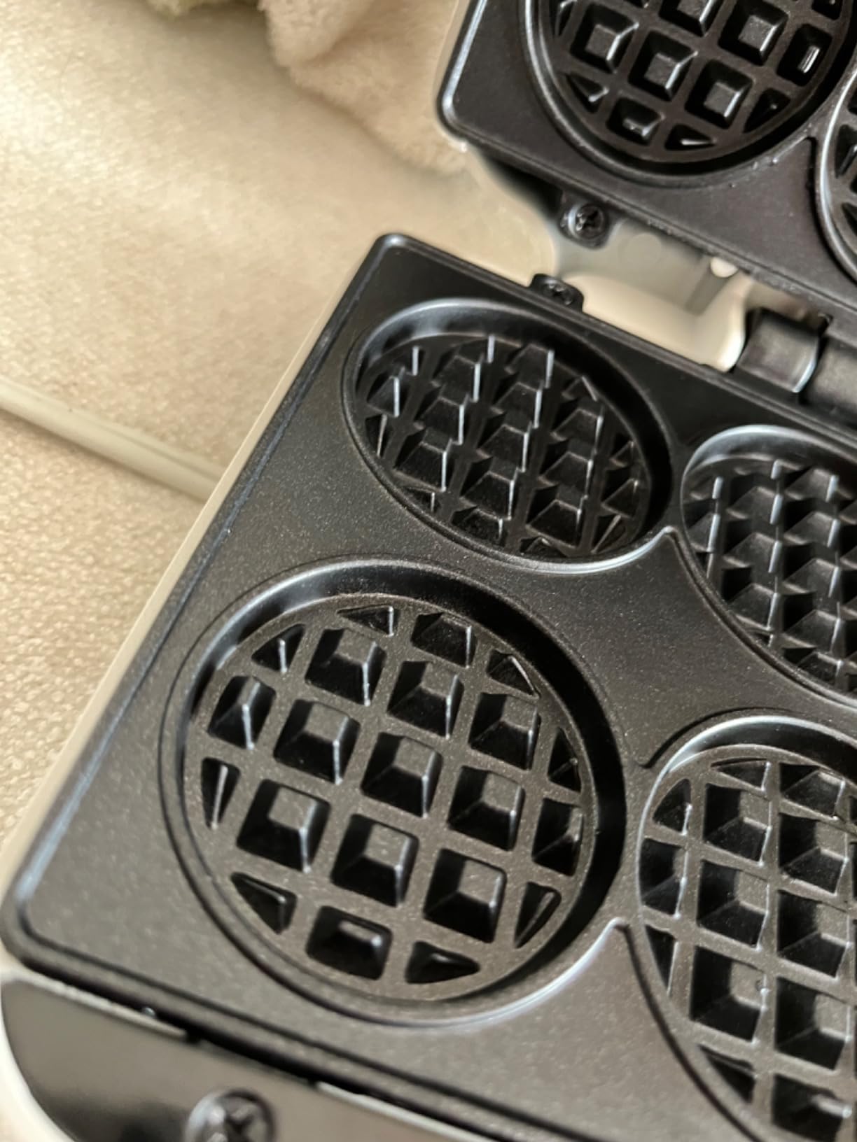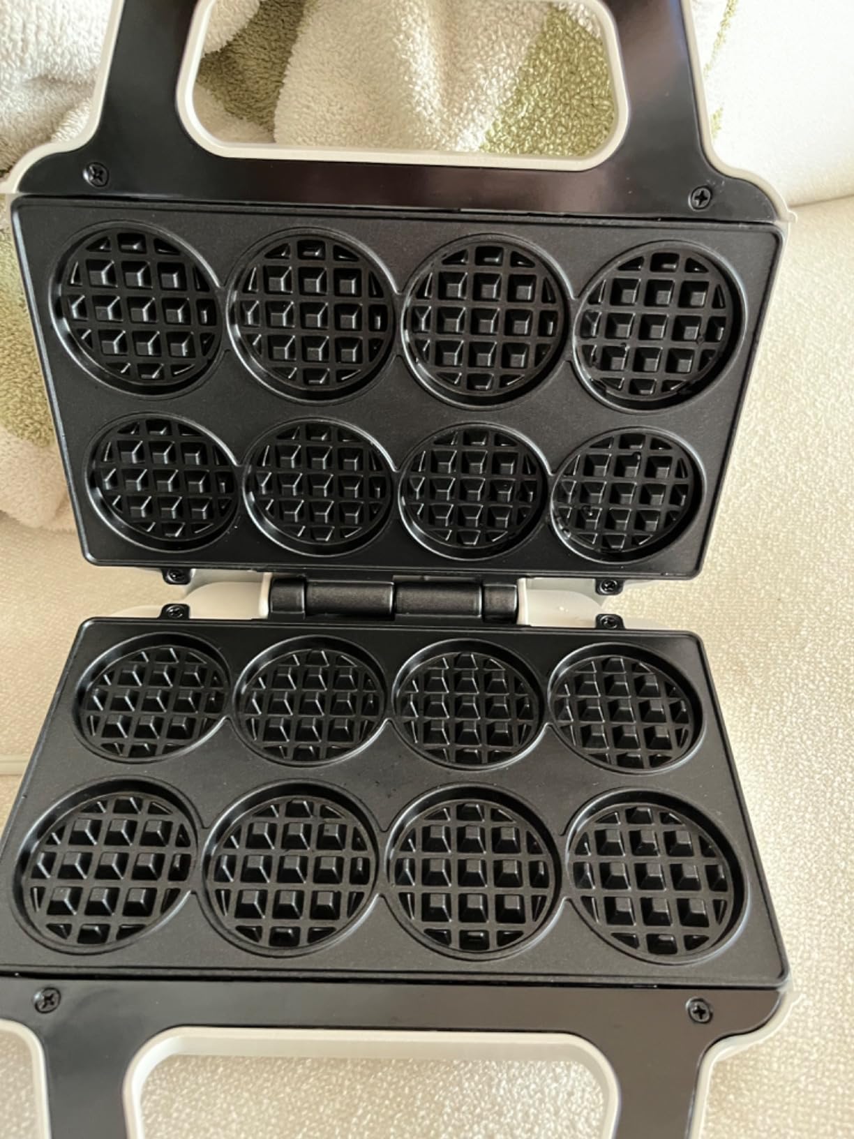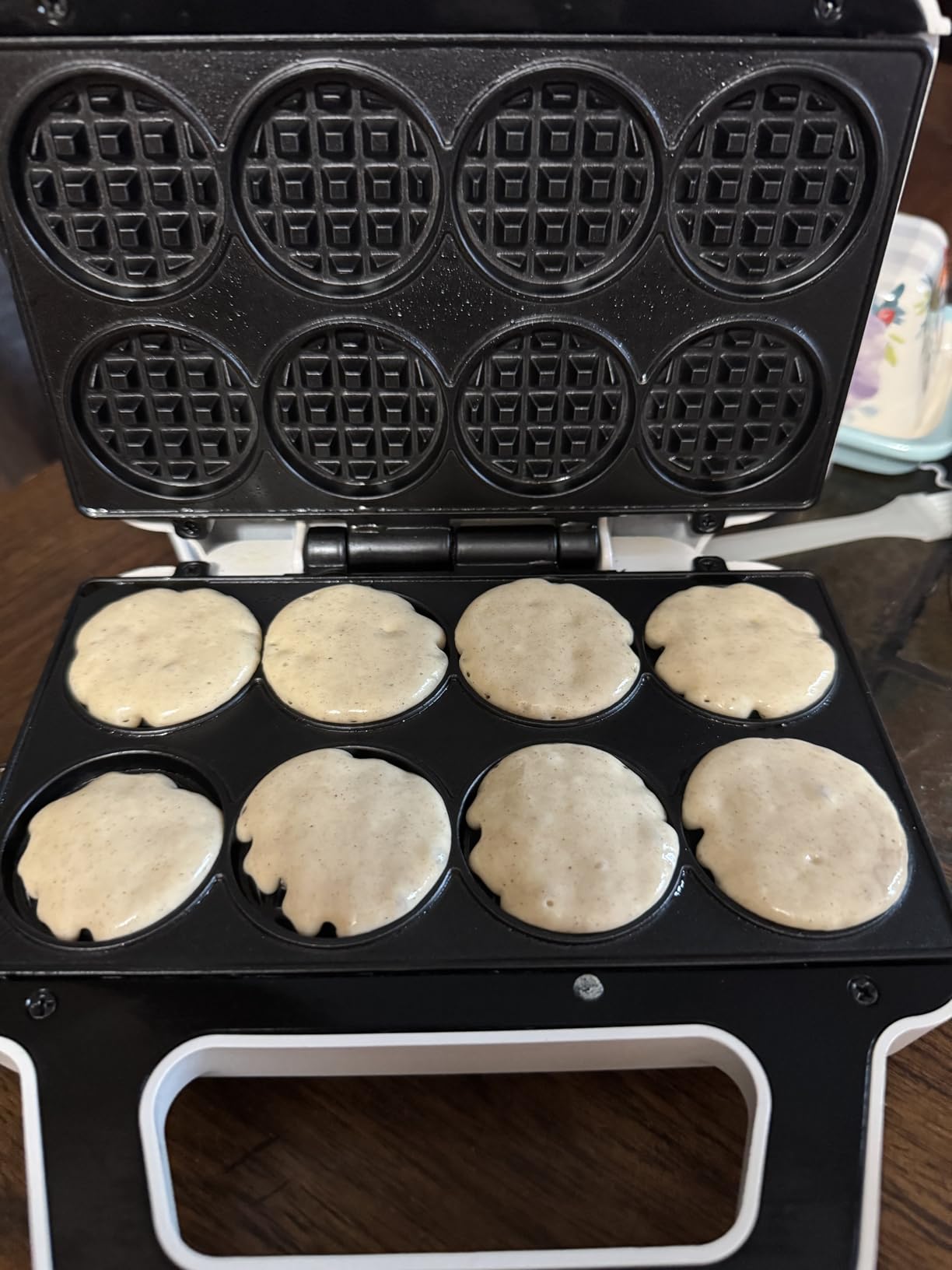 Once heated, I just use a little cooking spray top and bottom, pour in the batter, and secure the lid.