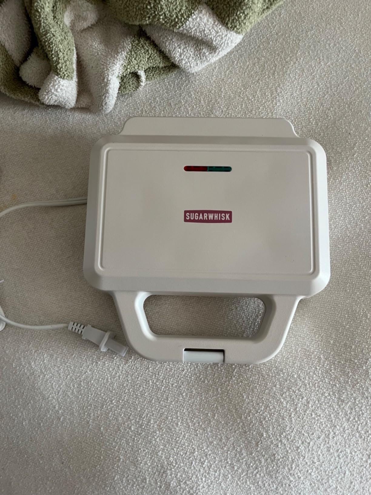 When closed, there are two indicator lights. Red means it's on. Green means the waffle maker has reached cooking temperature. It goes back to red only after the batter is poured in, then the green light comes back on when the waffles are done cooking.