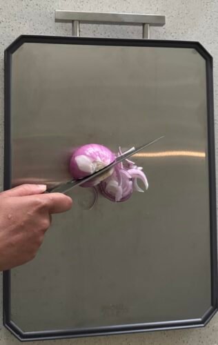 I loved this stainless steel cutting board, we can use both sides for cutting. The thickness and the size of this cutting board is perfect, great material and it’s durable too. I highly recommend this cutting board.