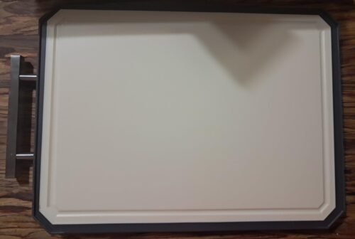 This cutting board is so attractive with a handle on it which give a good grip when cleaning and it actually makes a difference.It is durable and well-crafted.It has two sides in which one side is smooth stainless steel and other has a texture wheat straw surface.Since it is sturdy, well-balanced and doesn’t slide it is perfect for slicing fruit and vegetables as well as preparing meat.This SNOWCLAD stainless steel cutting board is worth of money.Love it.