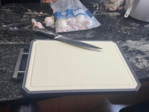 This cutting board exceeded my expectations. The size is perfect for prepping large meals, and I love having two sides — one for meat, one for veggies. No cross-contamination worries! Cleans up easily and still looks brand new after several washes. Highly recommend!
